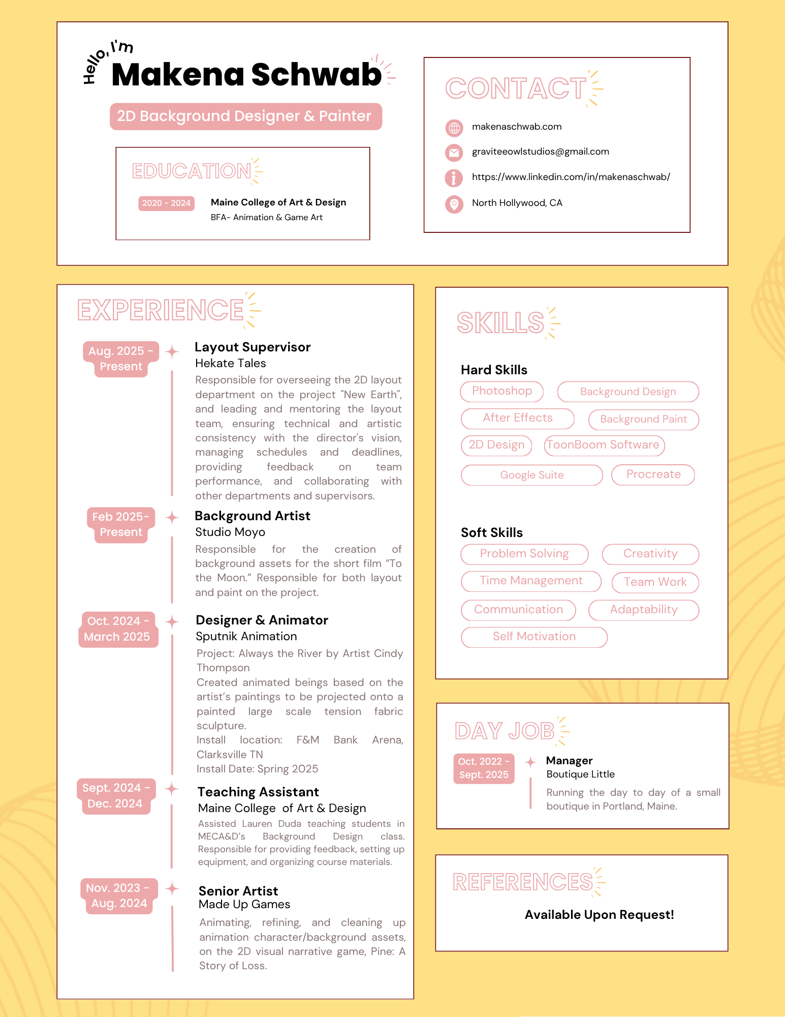 Makena Schwab is a 2D background artist based in North Hollywood, CA. She grew up in Enfield, Connecticut, moving to Maine to study animation at the Maine College of Art and Design- achieving her BFA in Animation in 2024. Makena has worked as a Freelance Animator and Designer for a variety of studios and businesses.